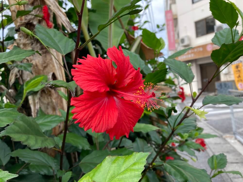 那覇の街角の花たちがキレイ!ブーゲンビリアにハイビスカスに日々草、ビオラも咲いています。