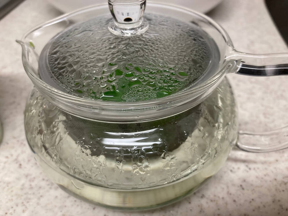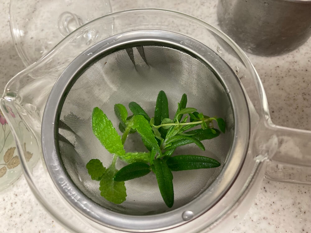 いつもは、ドライハーブも加えるのですが、今日は、ベランダで摘んだフレッシュハーブだけでハーブティーにしました。