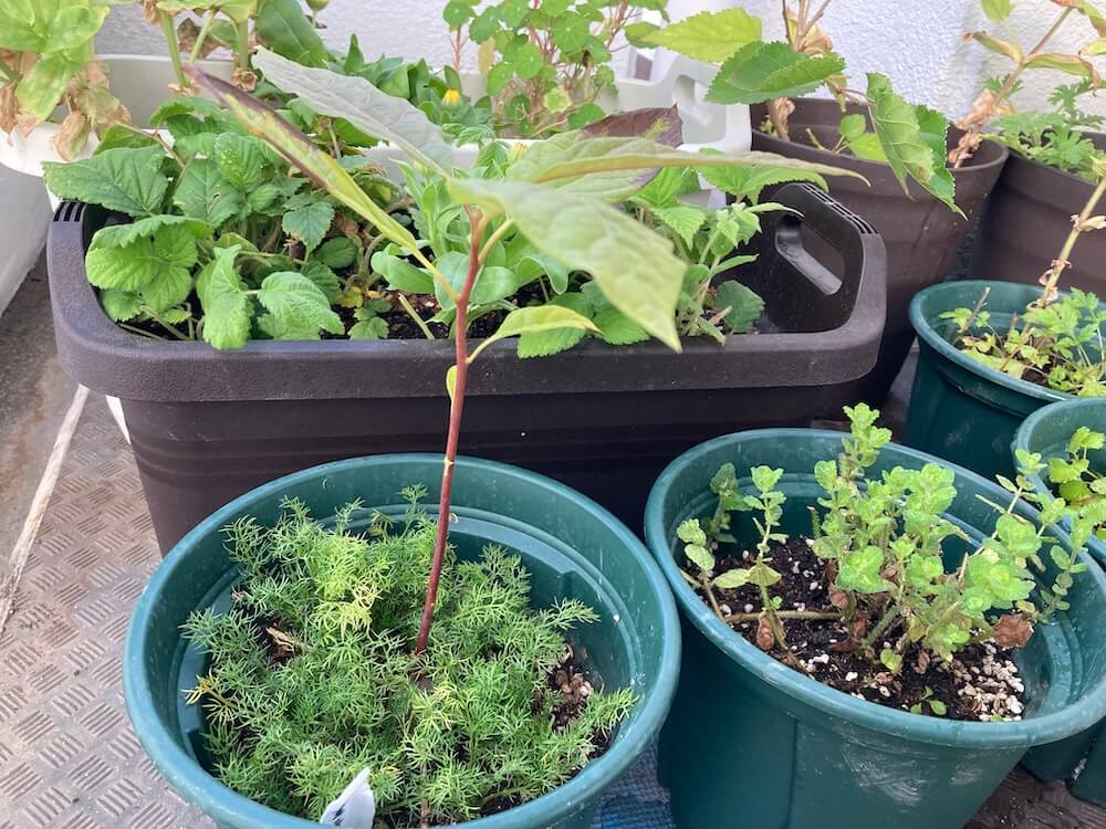 ハーブではありませんが、アボカドは、葉っぱの端が風のせいで、黒ずんできています^^;