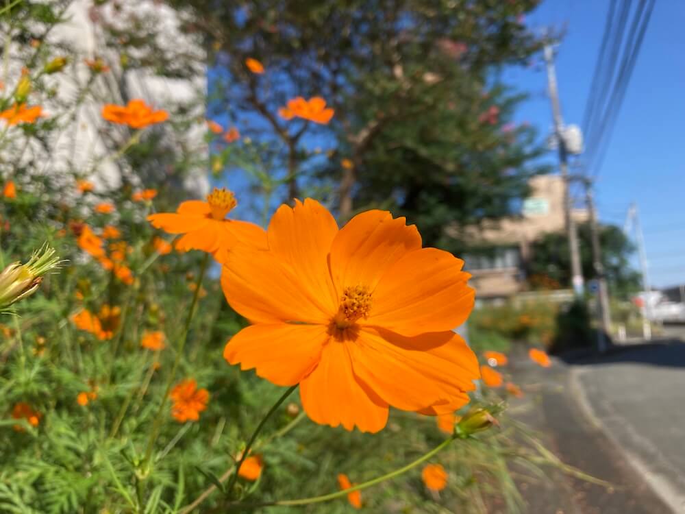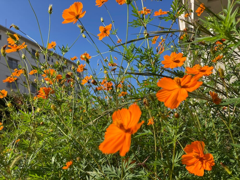 今年も、近所の花壇では、キバナコスモスの花が元気に咲き続けています。
