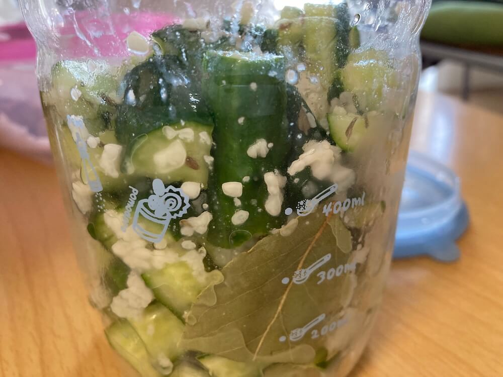 熱湯消毒した容器に、ローリエと塩をしたきゅうりを入れる