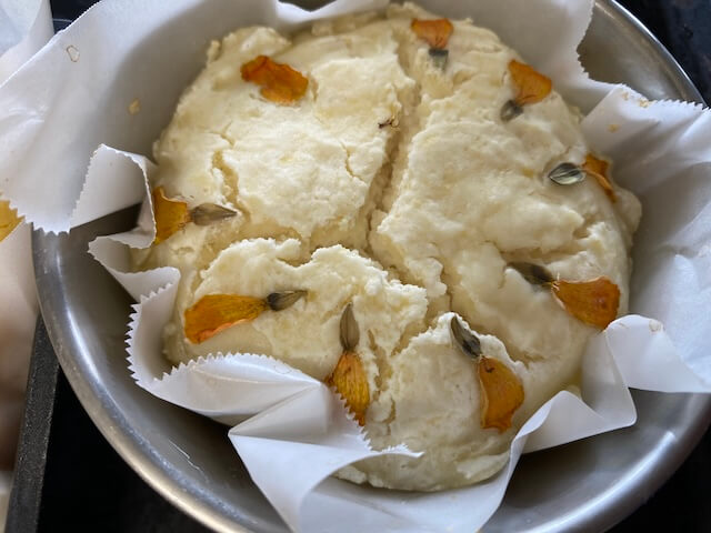 ジニア載せ塩麹豆腐パンの作り方は以下で桜の花をジニアに変えただけです。