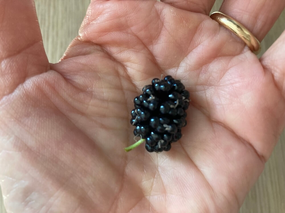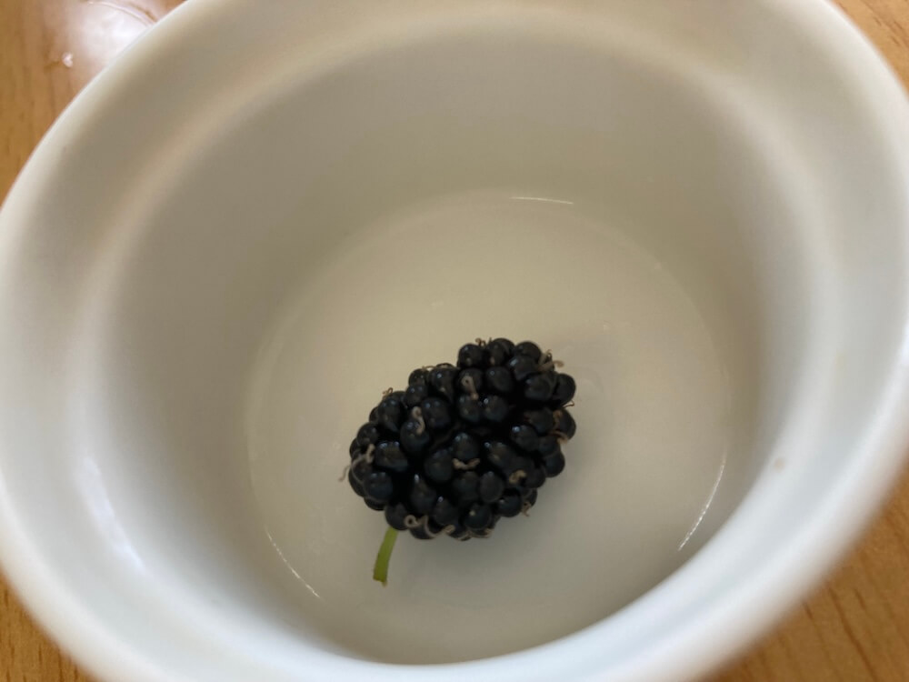 そして今朝、収穫したときのマルベリーがこちら。十分に熟していますね。