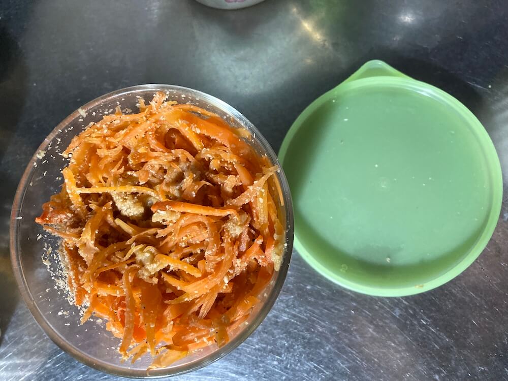 1天板にクッキングシートを敷いた上に千切りにした人参を載せて、上からお水50cc(材料外)を振りかけてオーブン180度で25分間焼きます。