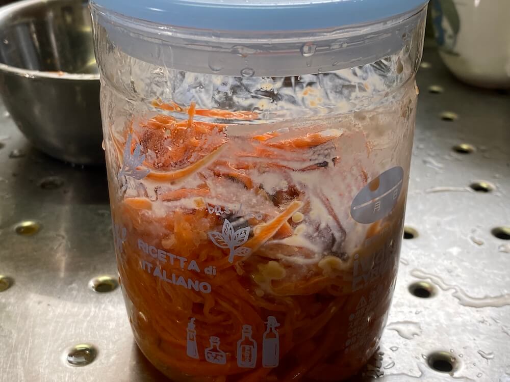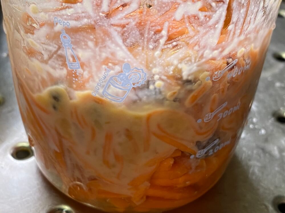 2熱湯消毒した容器に、1の人参と味噌、豆乳ヨーグルト、レーズンを入れて、よくかき混ぜる