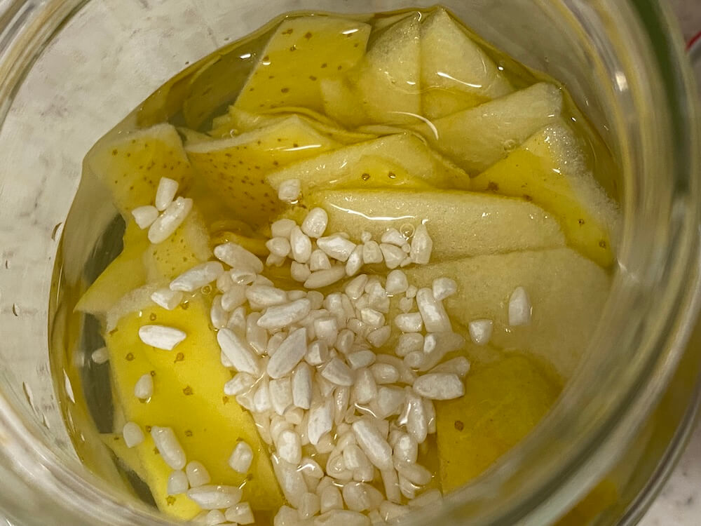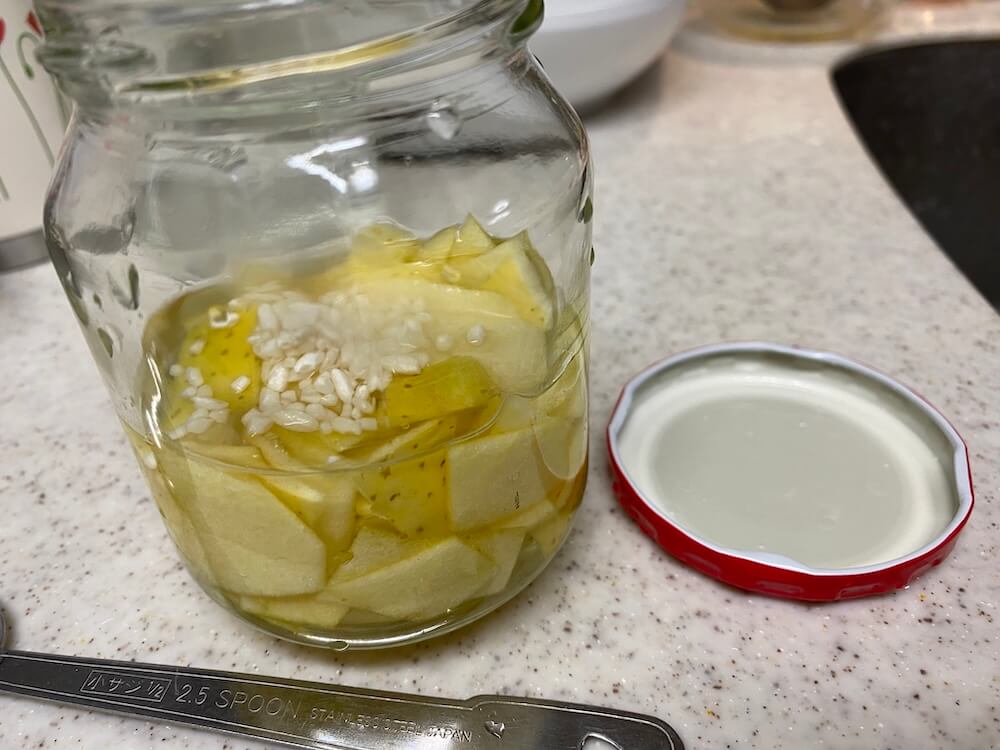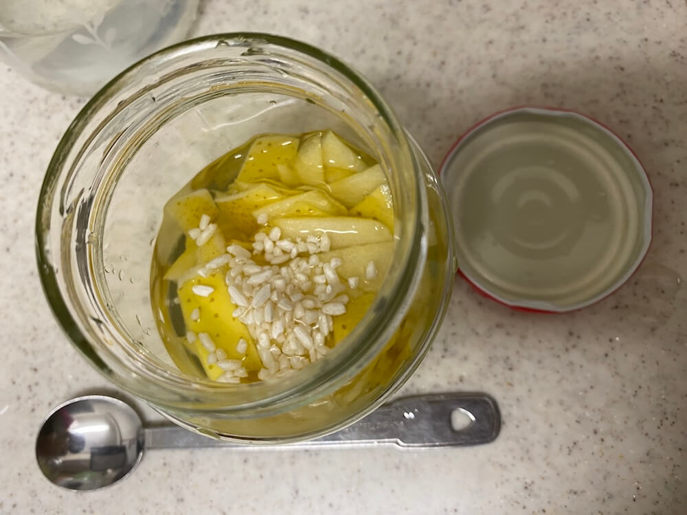 王林りんごの皮1個分に水100ccと米麹を小さじ1/2杯入れてみました。