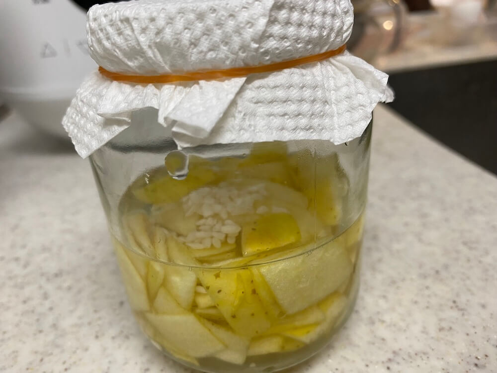 普通は皮ではなくりんごの果肉を使って、水と少し米麹を入れて2週間くらいかかったりするらしい。