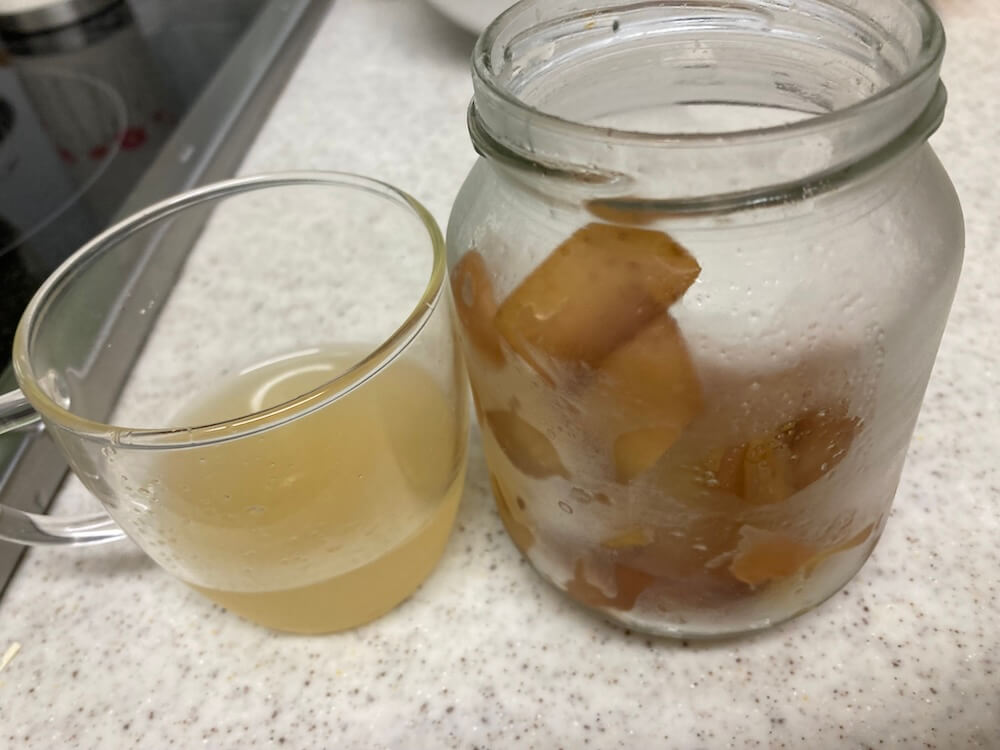 りんごの果肉の方で砂糖を使った酵素ドリンクは作ったことがありましたが、砂糖なしは初めてです。