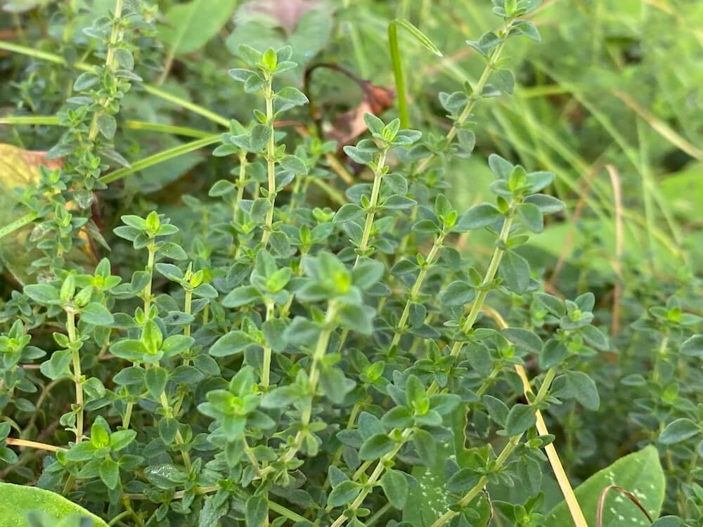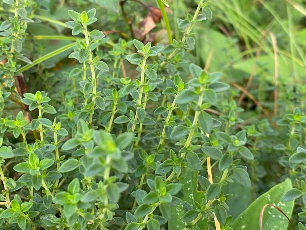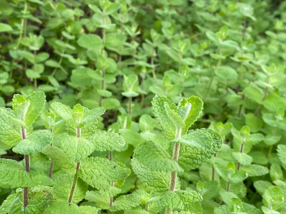 庭に地植えしているレモンタイムとアップルミントが元気いっぱいに茂っています。