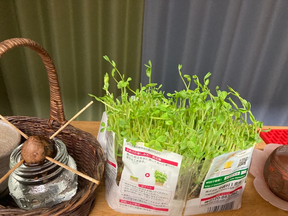 それで久しぶりに買ったんですが、豆苗をカットして食べたあと、根っこ部分に再び水を入れて育てて楽しんでいます。
