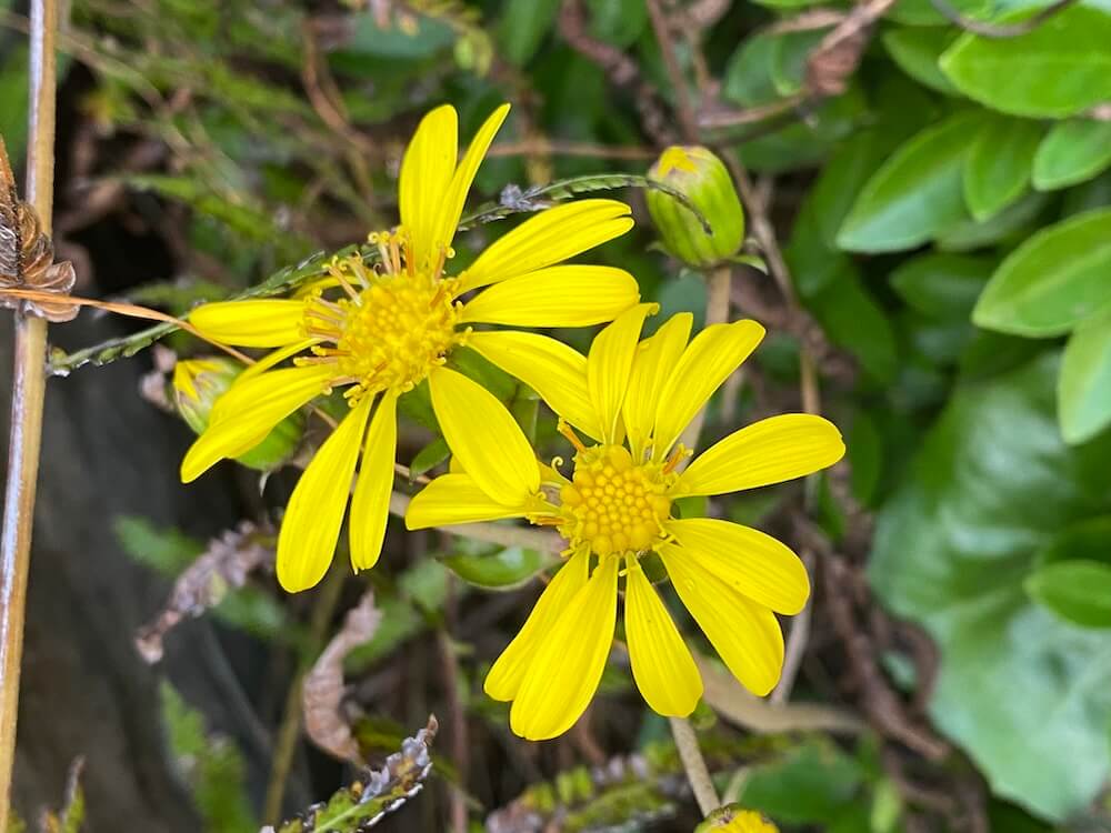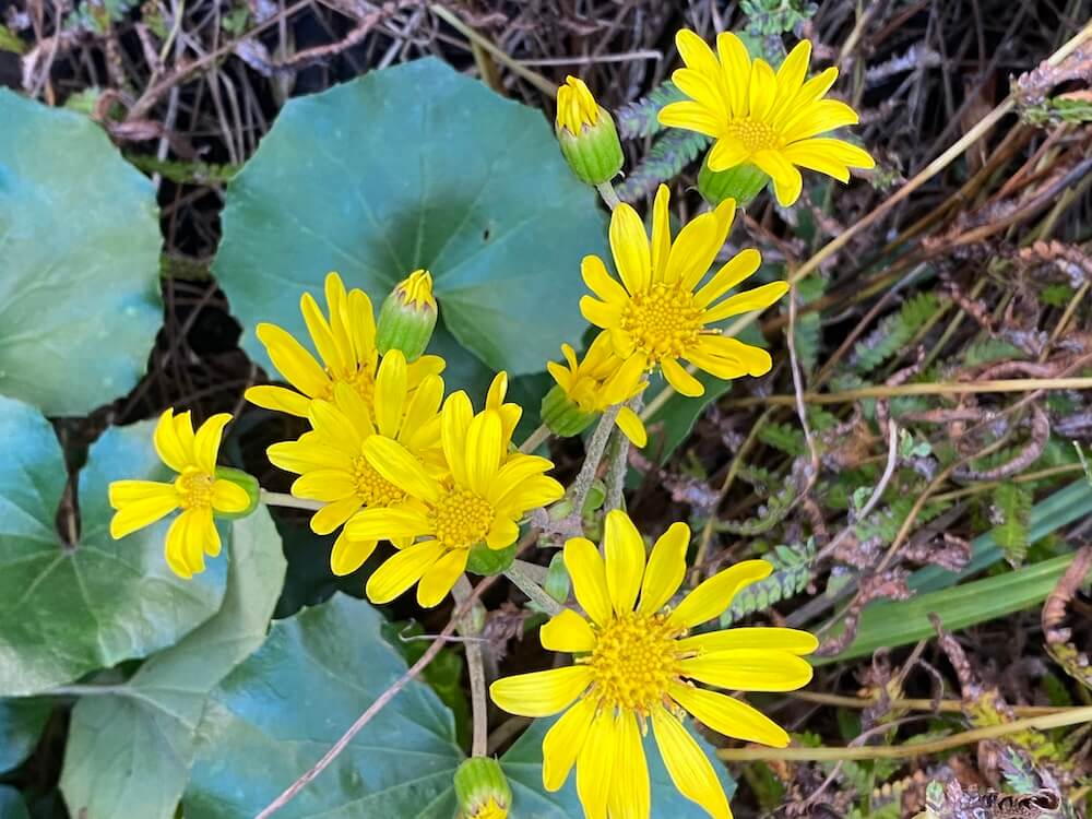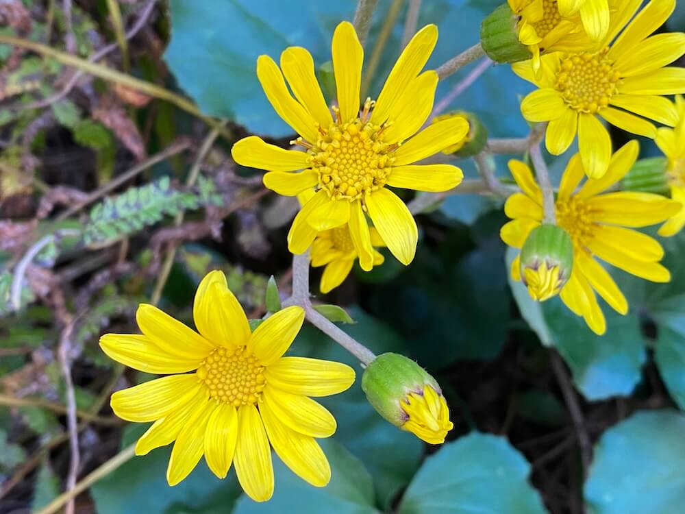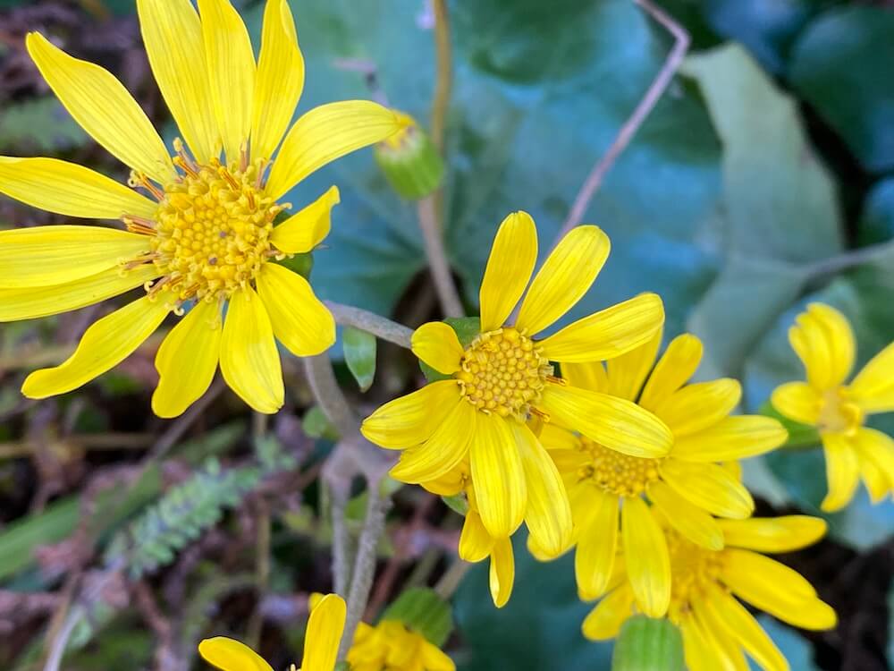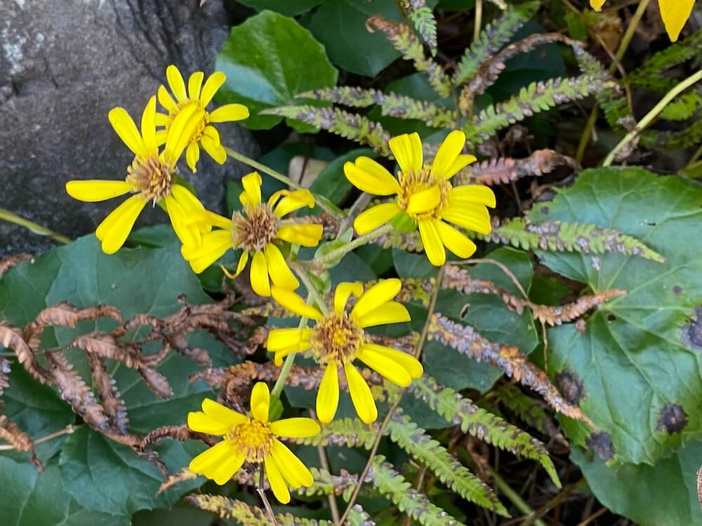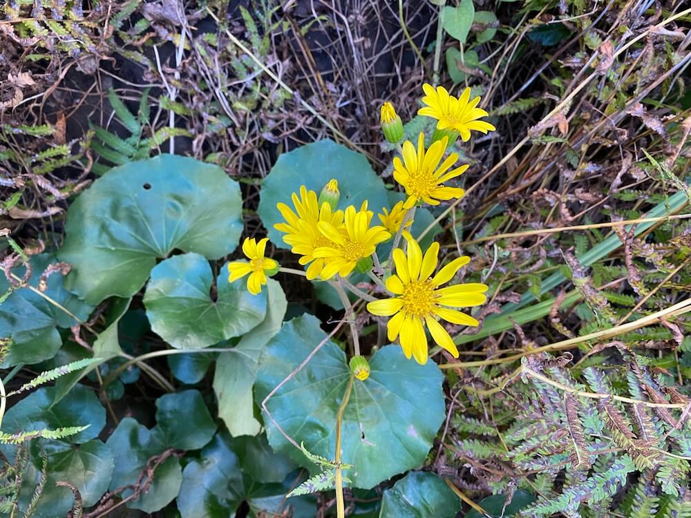 こちらは、寒くなって枯れかけた、シダの近くで咲いているツワブキの花たちです。