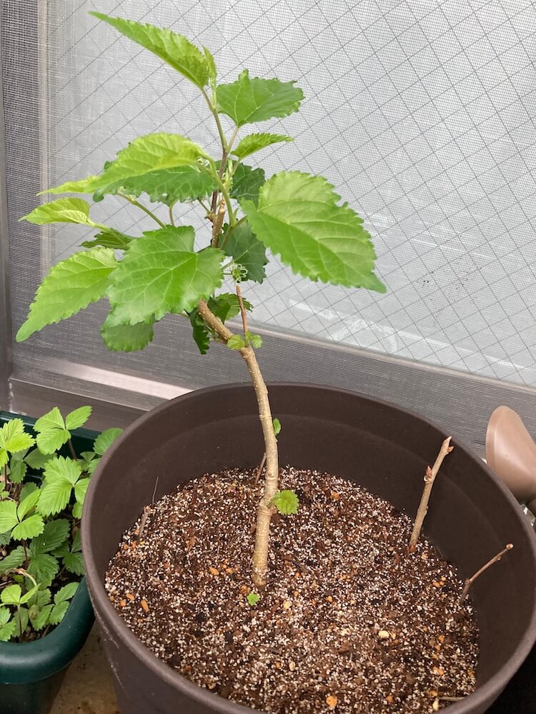 今朝は、それからマルベリーを単独で深めの植木鉢に植え替えました。